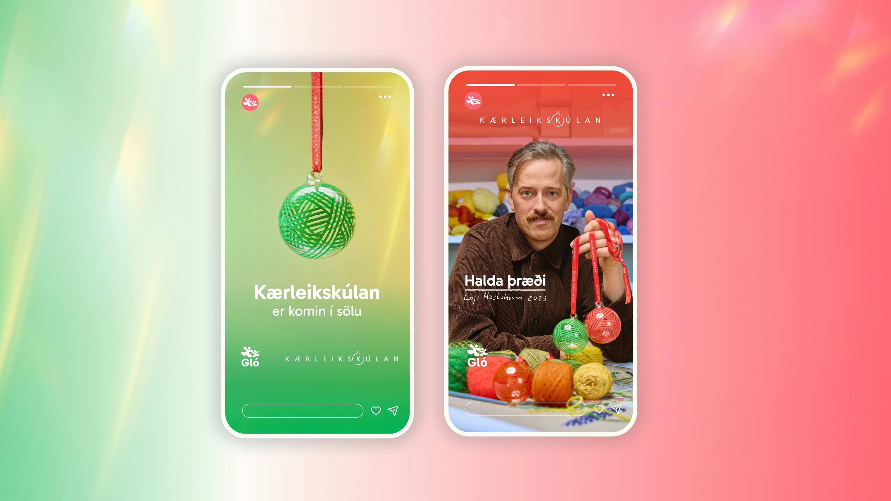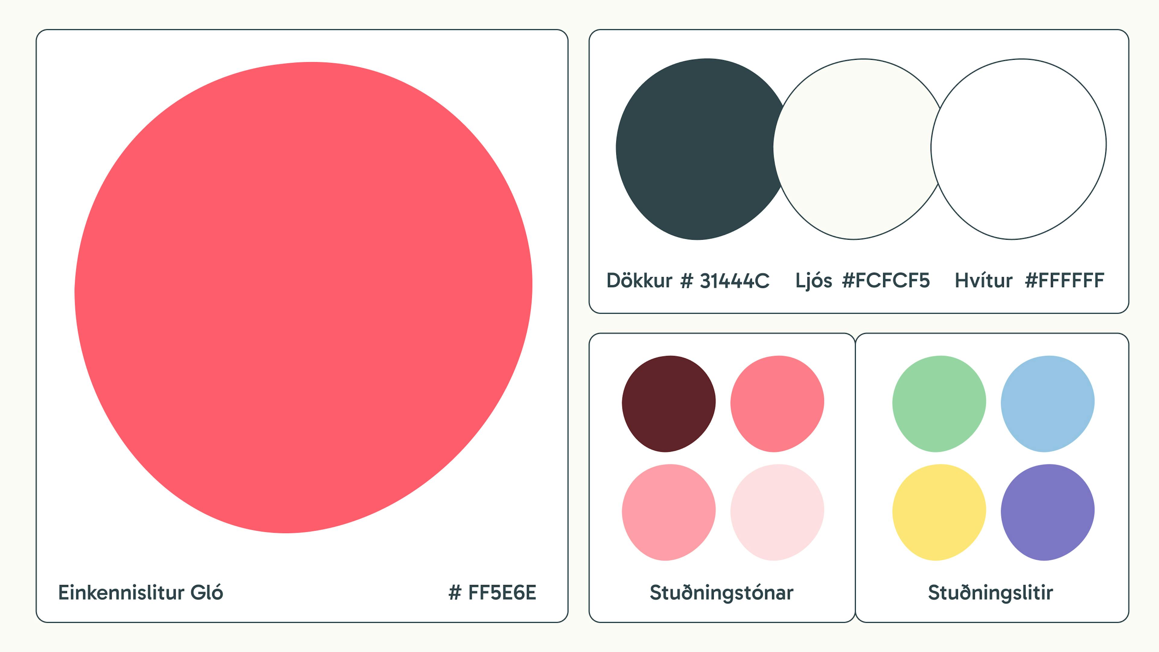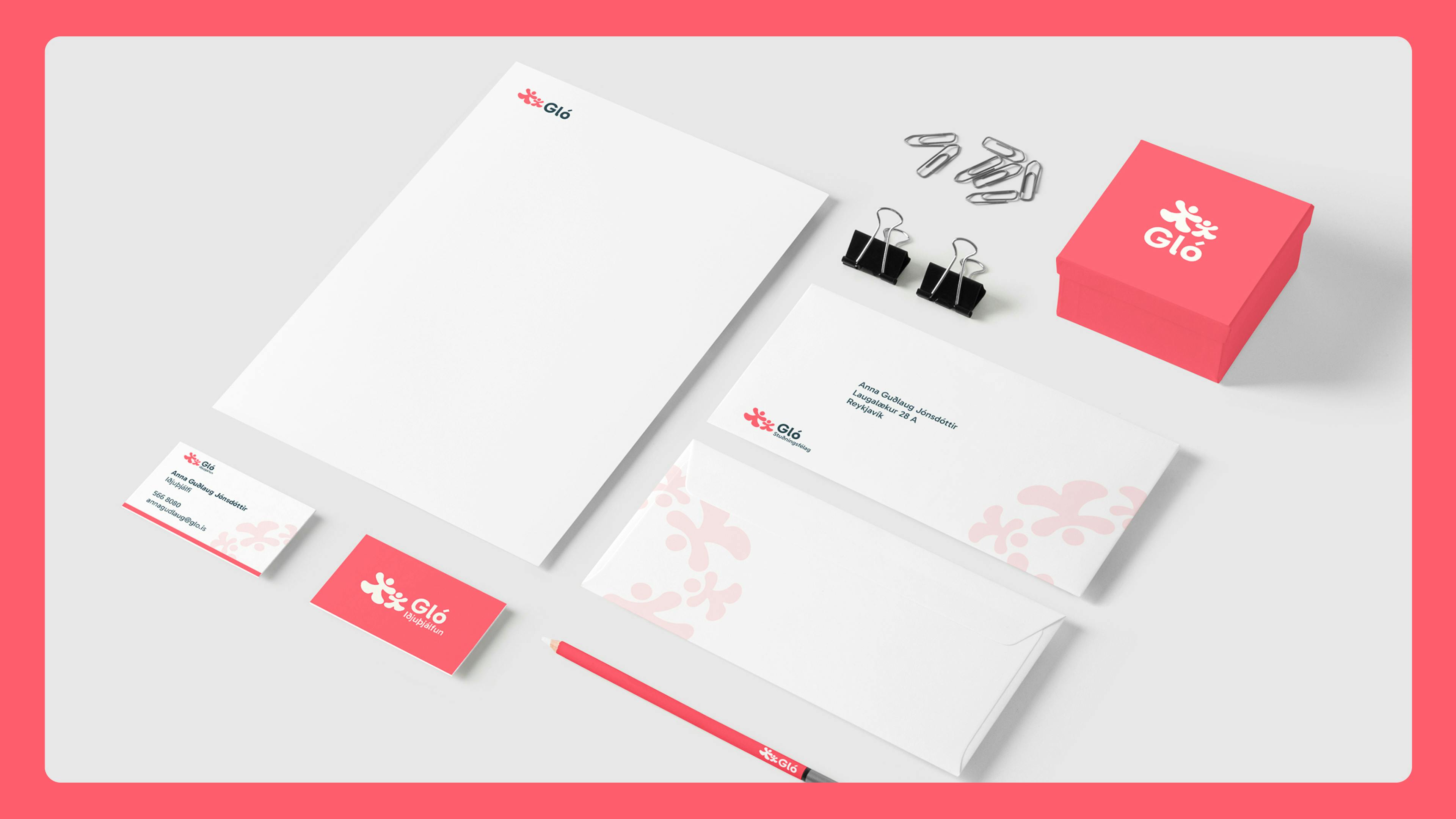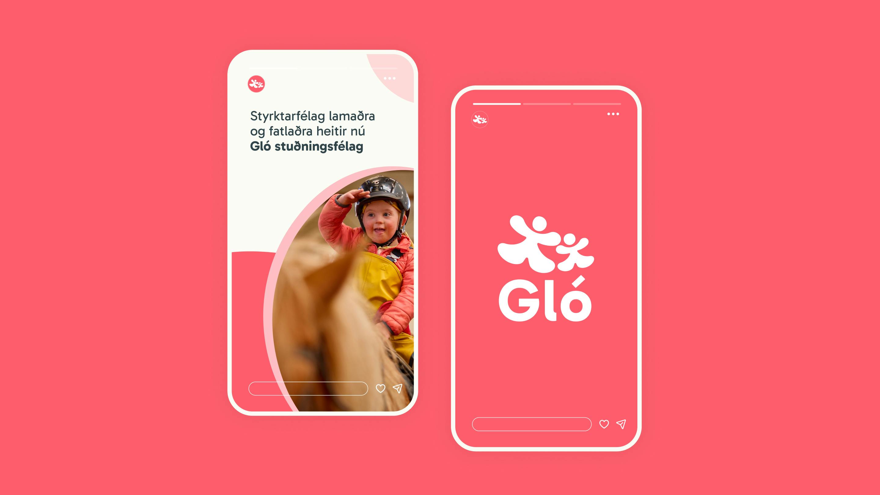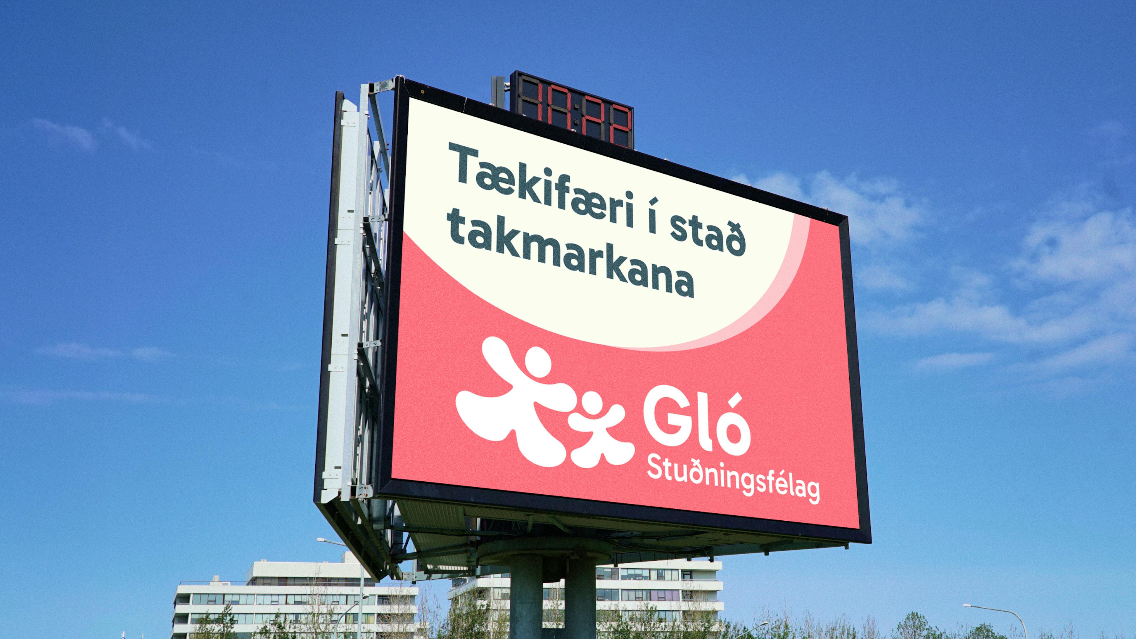 Myndmerki Gló er í líflegum fígúruformum sem vísar í stuðning, hreyfingu, umhyggju og gleði.
